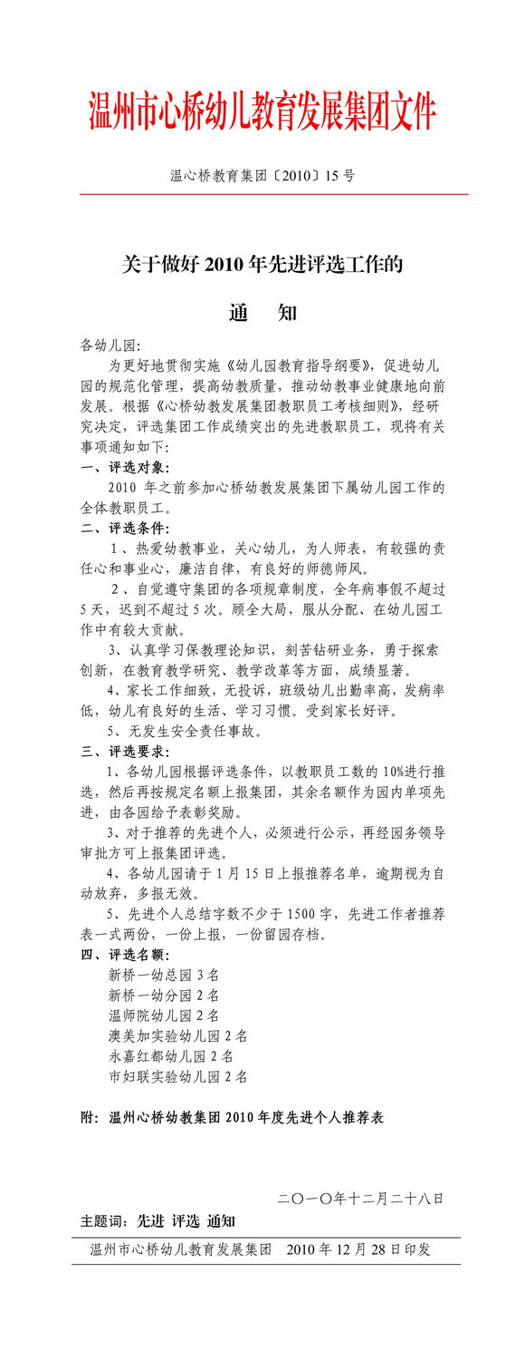 关于做好2010年先进评选工作的通知 发表时间:2010/12/28 11:13:24