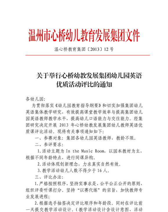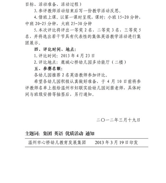 关于举行心桥幼教发展集团幼儿园英语优质活动评比的通知 发表时间:2013/3/25 10:02:00