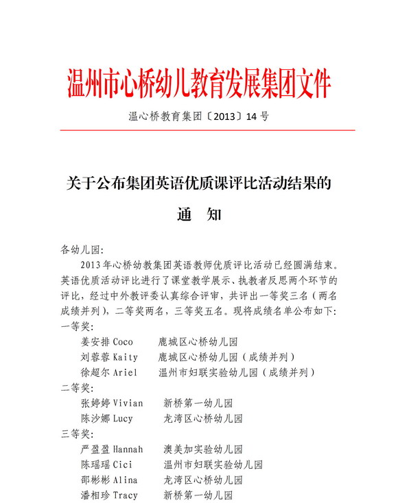关于公布集团英语优质课评比活动结果的通知 发表时间:2013/4/28 11:09:34