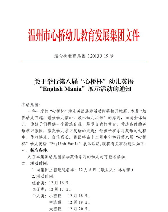 文件下载:关于举行第八届“心桥杯”幼儿英语“English Mania”展示活动的通知