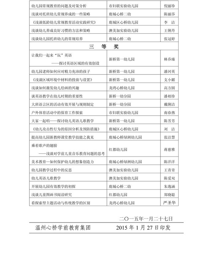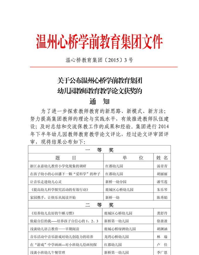 关于公布温州心桥学前教育集团幼儿园教师教育教学论文获奖的通知 发表时间:2015/1/29 15:38:09