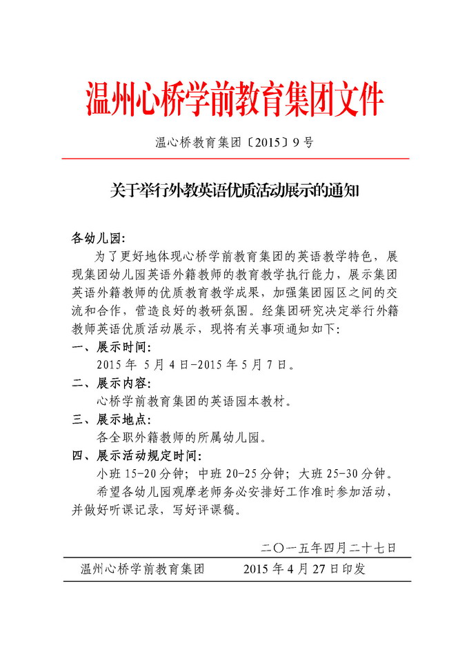 关于举行外教英语优质活动展示的通知 发表时间:2015/4/29 16:57:21