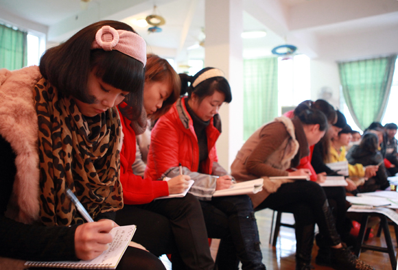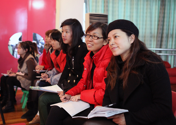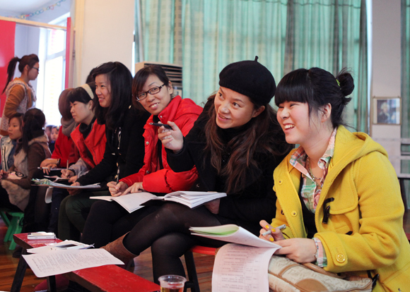 幼师班的班主任老师在认真听课(右一)