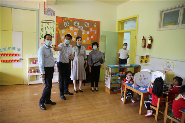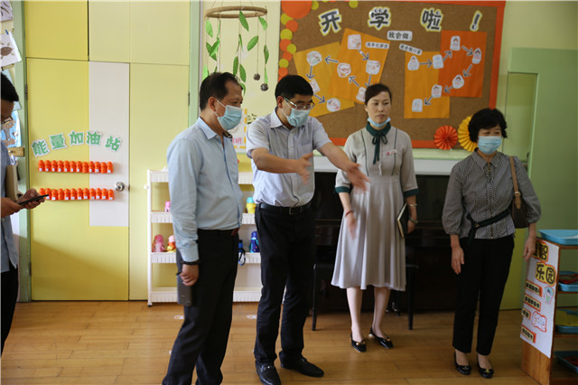 接着,他们来到已经开学的各班教室实地查看,充分了解。南园长就开学后,如幼儿用餐、如厕、午睡等环节如何扎实有效的做好一日生活各个流程,进行了详细汇报。市教育局领导们与孩子们亲切问好,点赞有那么多家长放心的把孩子送到幼儿园,并赞赏老师们在工作中的倾力付出。