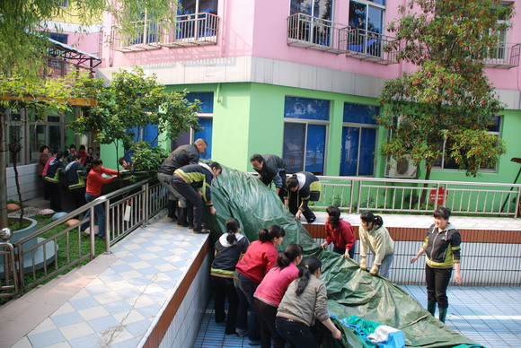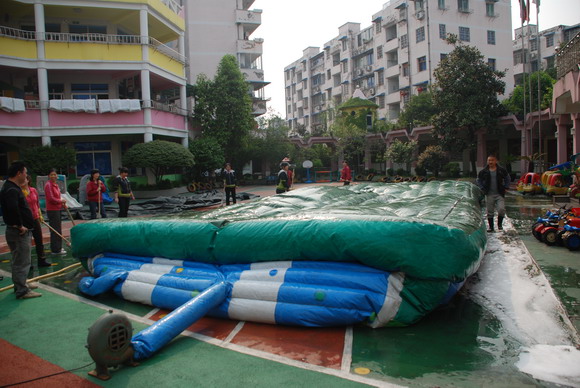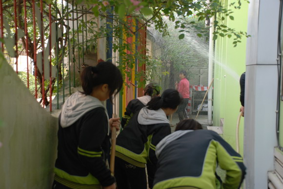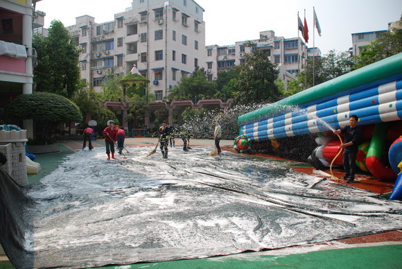 首先搬运淘气堡,淘气堡置放在游泳池里,把这“大家伙”请到大操场,可真不是件容易的事。全体保育员,再加上三位司机、门卫小童,整整28个人齐上阵,大家吆喝着“123、123……”齐心协力,费了九牛二虎之力,终于把它请了出来,所以说集体的力量是无穷的。接着,高岭组长将保育员分成三组,一组清洗淘气堡、一组为绿化带除草、一组刷洗围墙。保育员们分工合作,有拿刷子的,有拿扫把的,有拿水龙头的,每个人都是这么投入、这么认真、这么有干劲,热火朝天的劳动场面吸引了很多家长驻足观看,并纷纷赞叹幼儿园的环境卫生这么干净,很放心把孩子放到幼儿园。一个上午的劳动,又让校园神采奕奕!