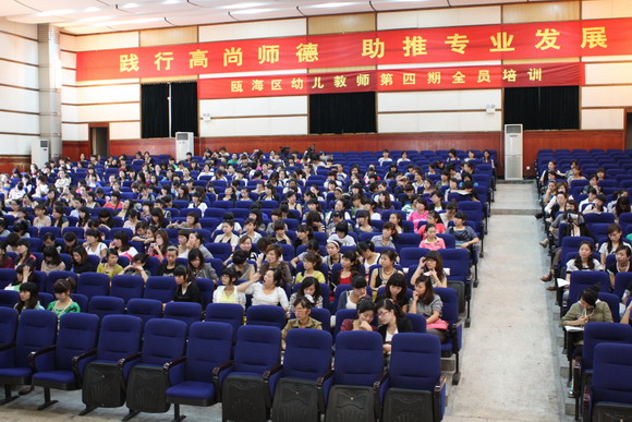 当秋的脚步款款而至,瓯海区本学期幼儿教师全员培训活动也拉开了帷幕。为进一步落实《温州市瓯海区教育局关于幼儿教师素质提升工程的指导意见》精神,探讨交流幼儿园课堂教学有效性的策略,切实提高课堂教学有效性,促进我区公民办教师课堂教学能力。9月25日,区教师发展中心在梧挺一中举办了全区幼儿教师的第四次培训活动,来自全区1000多位的幼儿教师参加了培训。