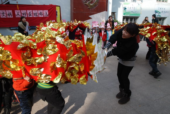 由小朋友组成的舞龙队也来闹元宵了