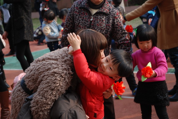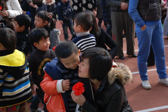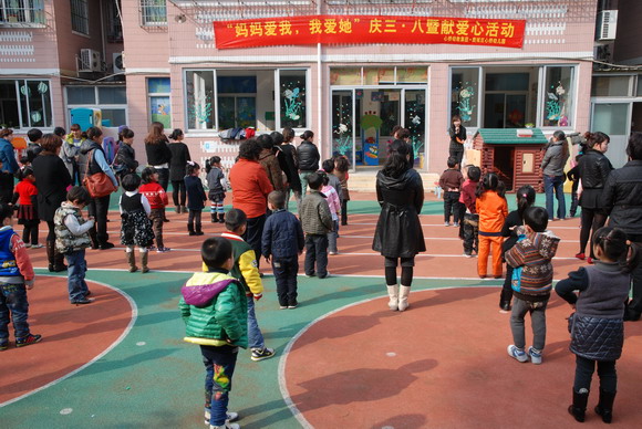 2011年是“三八”国际劳动妇女节101周年。为纪念国际妇女运动101周年,让孩子们知道,3月8日是妇女的节日,送上一朵花,祝福妇女节的真正意义,在这个充满浓浓情意的氛围中,共同庆祝这个属于全世界妇女的节日,我园诚挚邀请家长百忙之中抽空参与我们的活动,主题为“妈妈爱我,我爱她”庆“三·八”暨献爱心活动,于 3月7日、8日两个下午开展活动。活动分三个议程,第一个议程是带动跳,在我们幼儿园的操场上,随着音乐的响起,家长和孩子时而抒情、时而动感、时而活泼快乐,将音乐中的意境进行尽情表现和抒发。第二个议程是爱心捐款活动,家长和幼儿在老师的带领下有序进行着,献上自己的一片爱心。第三个议程是献红花,在感人的音乐烘托下,孩子给自己的妈妈、奶奶、阿姨送上一朵自制的红花,整个场上洋溢着欢乐的气氛。