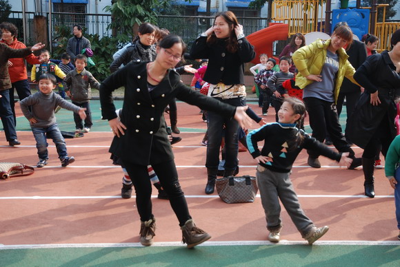 小朋友们和奶奶、妈妈一起唱,一起跳。
