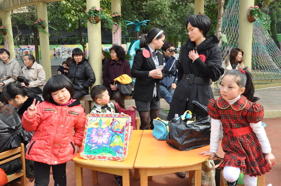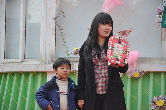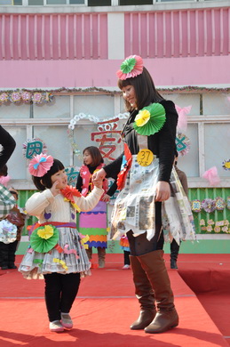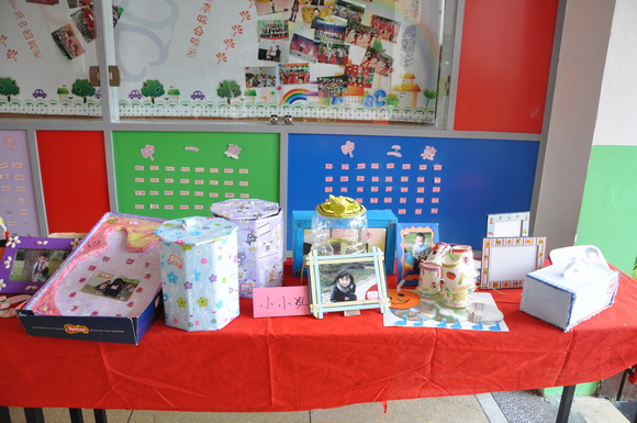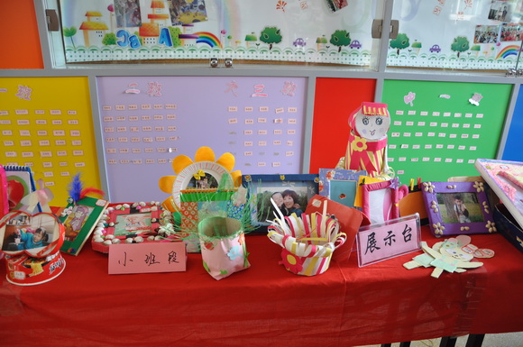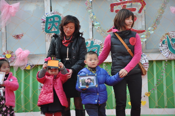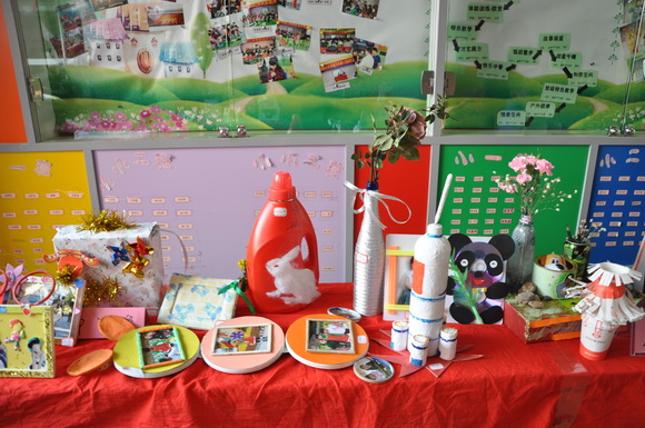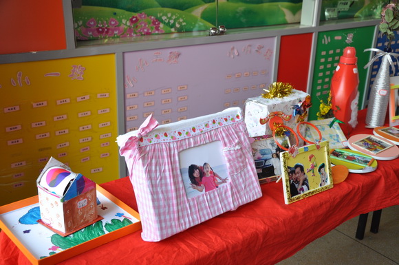 我们不但要求宝贝们和爸爸妈妈要注重保护环境,全体老师和保育员阿姨们更是心灵手巧,变废为宝,今天的舞台背景布置也由老师们巧思设计,利用废弃的广告纸、光盘等装扮而成,同时为了体现并凸显本次活动的主题,参加今天庆祝活动的家长均获得一份老师们精心准备的“神秘的礼物”,这份礼物也充分体现了老师们的巧手制作及环保精神。收集废弃的光盘,将参加活动的宝贝和家长的照片经过艺术的设计,制成可以永久珍藏的意义非凡的相框!