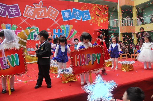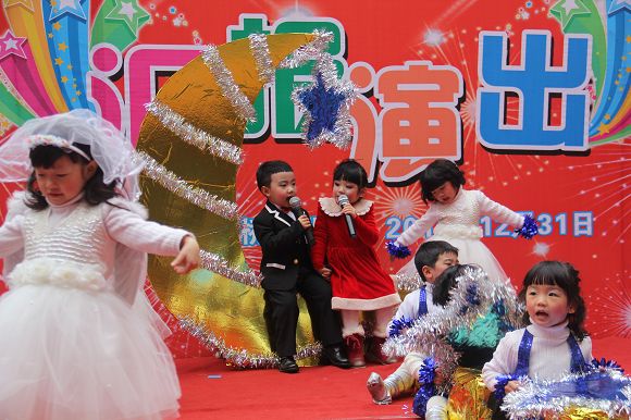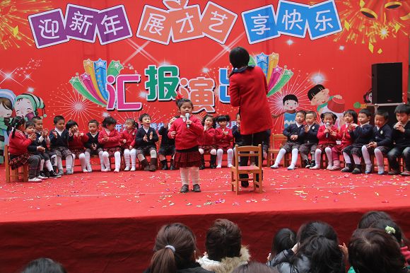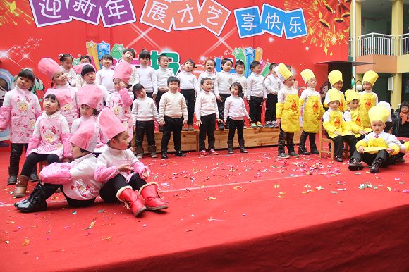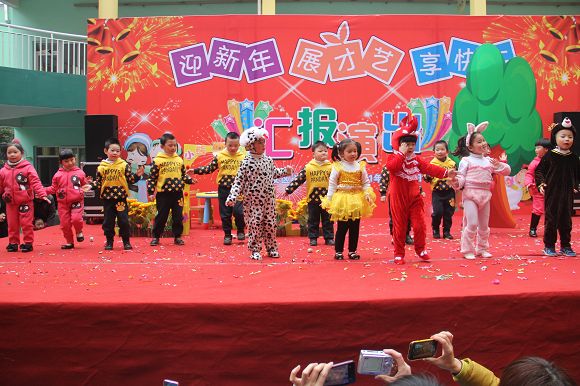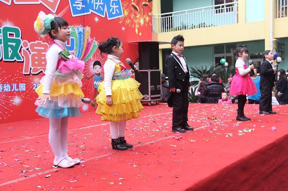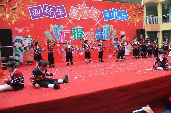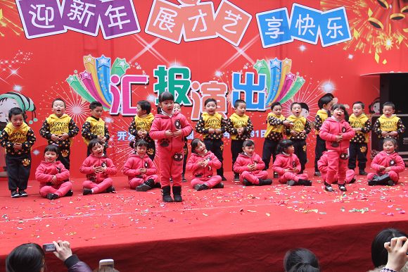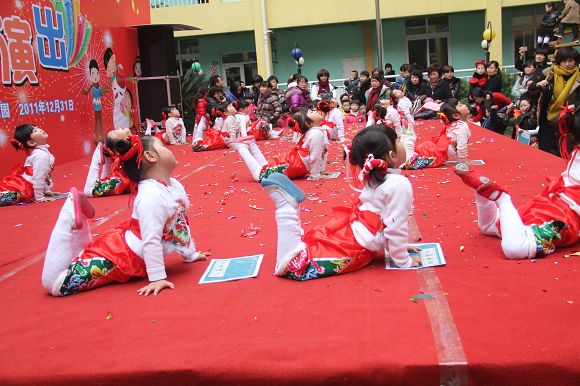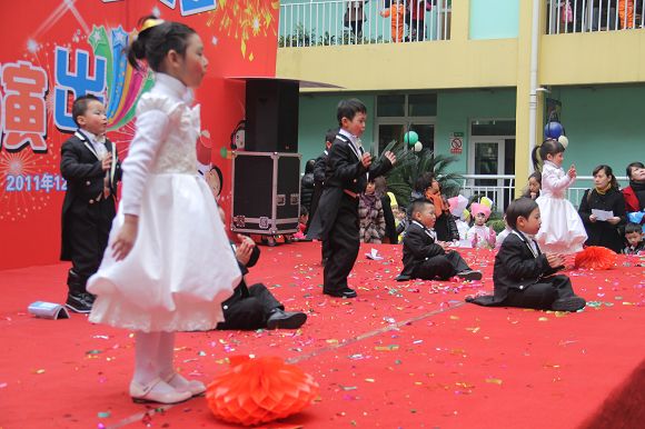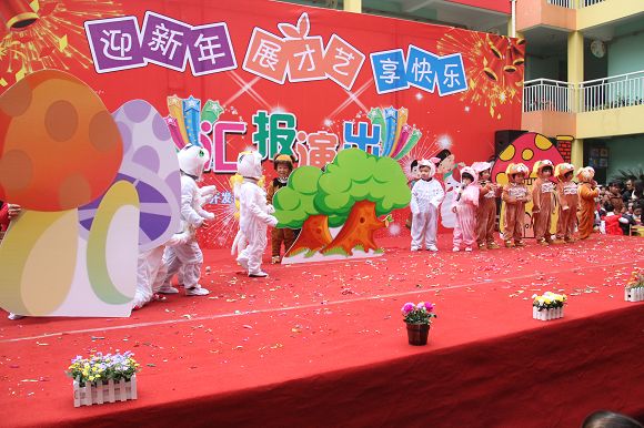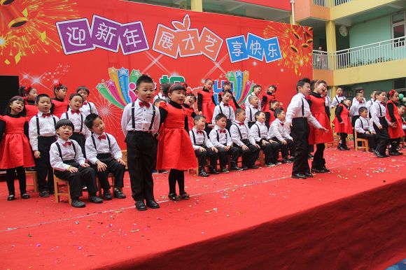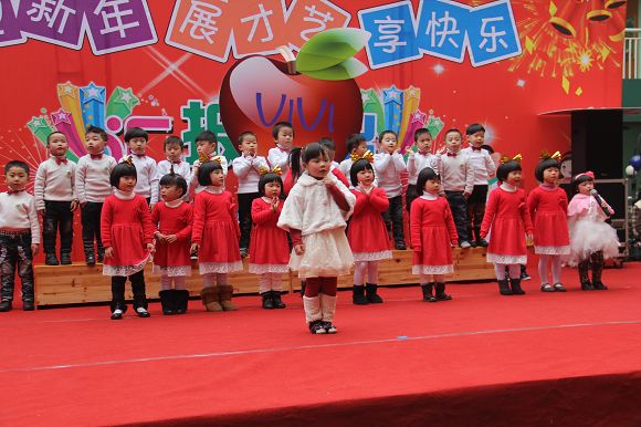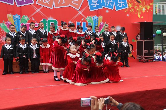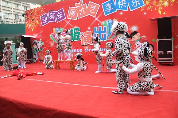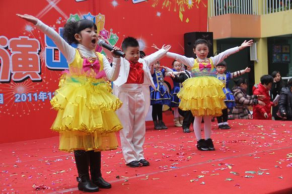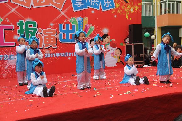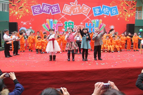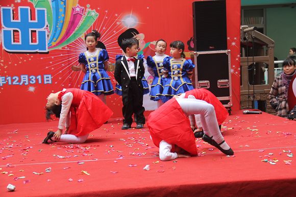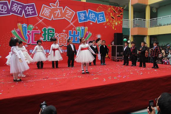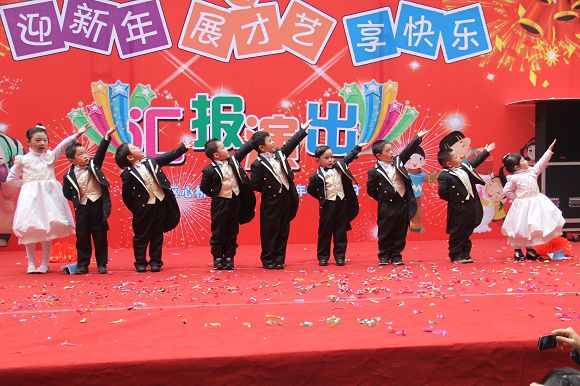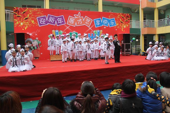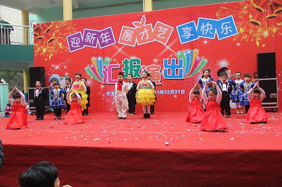 为了给孩子们营造一个热闹的迎新氛围,我们专门在一楼操场搭建了一个大型的舞台,给孩子更大的展示场地。2011年12月31号上午9:00演出准时开始,节目形式丰富多彩,有热力四射的舞蹈、有悦耳动听的歌声,有俏皮可人的主持。更有耐人寻味的英语歌曲串烧、生动活泼的英语情景剧、精彩的英语组合秀等等。本次活动保证了让孩子们人人参加,个个上台的演出原则。孩子们在舞台上表现得大胆、自信、敢唱、敢跳、敢演!赢得了在场所有家长的掌声和好评!