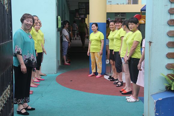 园长奶奶与老师、阿姨在门口迎接小朋友
