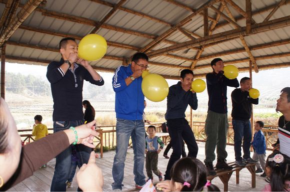到达目的地后,我们的第一个活动是亲子同戏。首先小朋友被分成了四组,草莓组、西瓜组、苹果组、菠萝组。每组被选出小组长,每组组员在小组长的带领下,在有限的时间内完成趣味50米单脚跳接力跑活动。在这个游戏中,每个小朋友为了自己组的荣誉而欢快的蹦跳着。他们不仅锻炼了身体,更增强了团队的集体意识。接下来,家长们也依照小朋友的分组情况分组,开展了皮筋接力活动。前面小朋友都这么卖力地为自己组而跳跃着,家长们怎么能落后呢。一个个站好姿、蹲好位,想以最快的速度让皮筋在每个组员的嘴上来回跳动1圈。功夫不负有心人,家长们不仅为孩子们出了一份力,也在游戏中收获了快乐。2个游戏之后,亲子共同参与。孩子和家长大手牵小手玩起了呼啦圈接力和踩气球活动。大家你扭腰来我翘臀,你踩球来我提脚,大家玩得不亦乐乎。