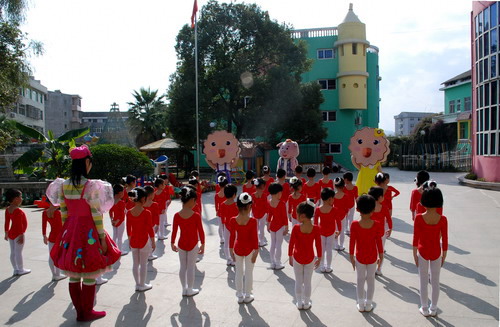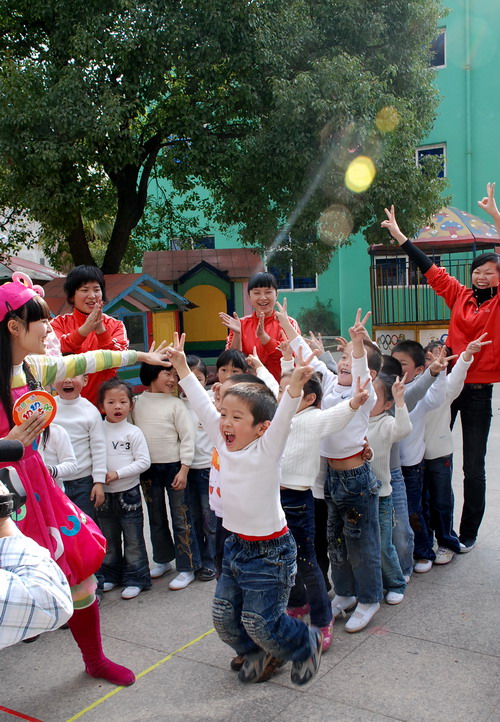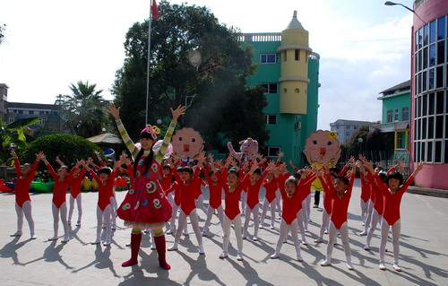 首先录制的是小朋友跟彩虹姐姐一起做的"幼幼操." 现虽值深秋季节,可正午的阳光还是直射得人冒汗.但小朋友却没有一个撒娇,态度极其认真,动作准确到位.跟彩虹姐姐配合得相当默契,摄像几次就通过了.看!