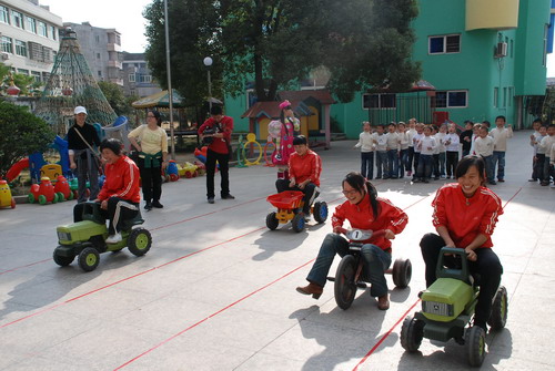 接着,在彩虹姐姐的带动下,师幼互动玩起了接力赛车车的游戏.