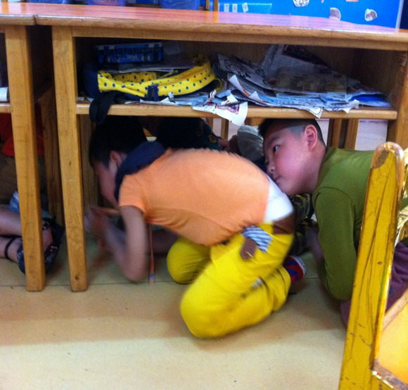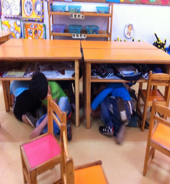 5月10日晨会上幼儿学习在地震中,怎样保护自己。