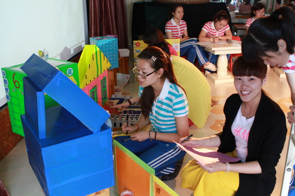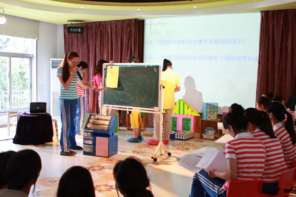 紧接着是教研组针对两个活动中《数学操作材料的有效选择和运用》的现场研讨。老师们在组长带领下通过分析制作的教具,梳理了操作材料在活动中有效利用一些策略,又从实际出发,设计符合幼儿心理发展规律,融知识性、趣味性、实用性为一体的数学操作材料,使幼儿既能玩有所乐,又能玩有所得。