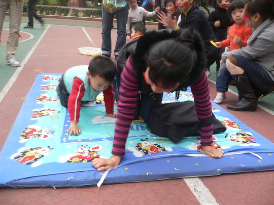 交流完毕以后,各班级都举行了一场别开生面的亲子活动《小乌龟爬爬爬》。由老师将家长与孩子分成红、黄两队。先是孩子乌龟爬,从一条垫子的一端爬到父母坐着的那端,然后孩子给爸爸妈妈打扮,给他们贴上腮红。打扮好后的家长牵着孩子继续前进到指定的箩筐前,让孩子从中选出黄色海洋球,妈妈选出红色的海洋球,再往回跑,把海洋球放进另一个箩筐,最后完成任务的小朋友将乌龟壳交给下一位小朋友。