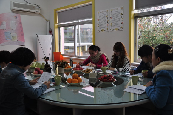 然后就本学期集团英语工作计划与大家做了详细的交流,以紧抓课堂教育变革契机,打造“生本教育”课堂;贯彻《指南》文件精神,推进游戏化活动进程;优化一日生活,全面提升英语运用于交往能力;搭建研究、展示、交流的平台,加强队伍建设这四项为本学期的主要工作。会议上各位业务园长们认真聆听,讨论热烈。