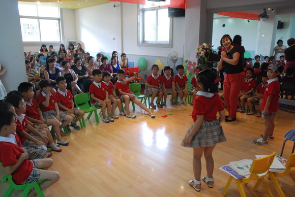 孩子们进行户外区域的活动展示 园长助理朱老师就“阳光体育 快乐成长”的户外区域活动展示的汇报 在潘老师的带动下,大家轻松一下。 常务副园长潘老师就“快乐英语,伴我成长 ——谈谈我园致力于幼儿英语特色教育”的汇报 外籍教师LYUDMYLA向大家展示了一堂生动、轻松、愉快的英语课堂 王老师对本次展示活动点评 集体合影