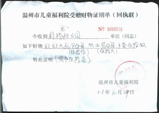 早上9:00我们跟百晓讲新闻栏目、温州都市报、晚报的工作人员,以及我们全托大一班的小朋友到社区跟清洁工爷爷、奶奶一起扫地,让他们体会清洁工工作的辛苦,让幼儿懂得保护环境的重要性。在幼儿们得到教育的同时,为了感谢环卫工人的辛苦工作,我们还给每位清洁工送去了新年礼物和红包以表心意。接着我们启程去了市儿童福利院,给那里的孩子送去的新年礼物,让他们也感受到我们的关爱,感受新年的快乐。同时还送去了5000元的慰问金,为福利院的孩子献出一份爱心。下午我们跟百晓讲新闻的主持人以及工作人员到苍南慰问了在台风中失去双亲的五个孤苦伶仃的孩子,给他们送去了3000多元的年货:衣物、被子、暖水壶、水果、肉松……并给了1000多元压岁钱。然后我们去了电视新闻曾报道过的苍南“大舌头”幼儿,令我们欣喜的是,这位孩子手术后已能正常生活了,我们给这个困难家庭送去了衣物,并给了这个幼儿500元的的压岁钱。