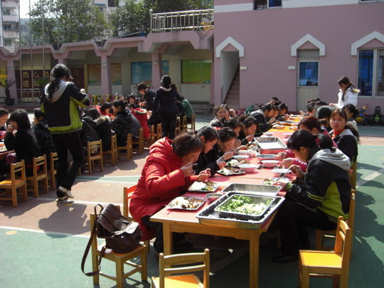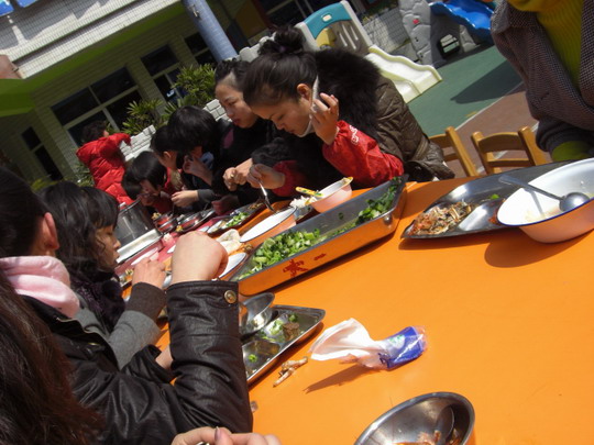 中午,暖暖的阳光洒在操场上,我们摆起了长长的桌子,端出了一盘盘香香的菜肴,大家开始品尝他们的作品。瞧,他们都吃得津津有味呢!最后每人都为自己心仪的菜投出了宝贵的一票,有的老师还说:"都很好吃,真不知道怎么投呢!"经过统计秦芝凤的虾获得了15票,共花费了80元;邹丽华的炸鸡翅获得了5票,共花费了92元;小魏的河蟹获得了15票,共花费了200多元;谢冬兰的汤以25票获得了优胜,她的材料一共只花费了60元,既做到了色香味俱全,又考虑到了经济实惠。