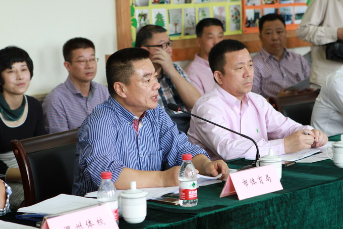 随后,刘鹏局长一行来到温州体育运动学校参加学校举行的会议。会议上,温州体育运动学校校长方志方详细介绍了学校近期体育工作情况。接着徐炳兴董事长向刘鹏局长汇报俱乐部成立以来的训练工作和体育成果,详细介绍了俱乐部由民营资本和体育专业机构联办体操俱乐部的合作模式,即心桥学前教育集团和温州体校联合创办。徐董事长还阐述了俱乐部创办以来的三个理念,即提倡“快乐体操”的理念,提倡制度规范化的理念,提倡文化课、训练两不误的理念。汇报了俱乐部两届省运会体操类项目取得25枚金牌的成绩和为省体操中心输送的体操类后备人才艺术体操18人、体操19人、蹦床20人。最后徐董事长表示:“我期待有一天俱乐部培养的选手能在国际赛场上不仅要让国旗升起,还要让国歌奏响,这是我的梦想和毕生愿望。”
