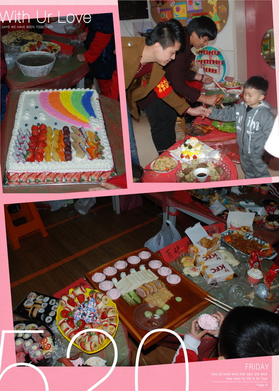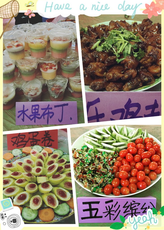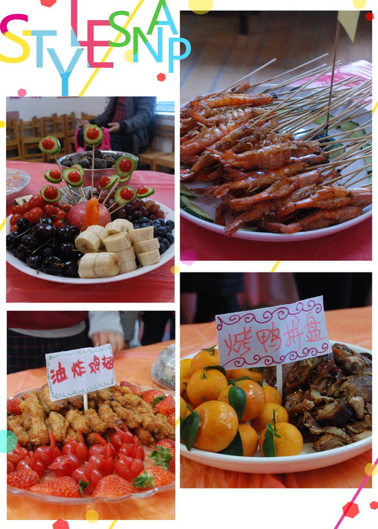9点来钟,家长们和孩子们带着各式丰盛的美食陆续来园:有些家长带来了创意的水果拼盘、有些家长带来了各种点心类的糕点;还有些家长带来各类海鲜、特色小吃、冷盘类等食物。不一会儿,各个班级都摆满了各种特色小吃,直看得人眼花缭乱,孩子们说闻着香味都要流口水了。