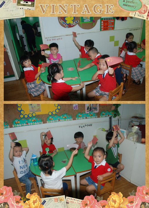 各年龄段的孩子们在老师们的带领下开展了一系列既有教育意义又愉快丰富多彩的庆国庆半日活动。活动高潮不断,掌声不断,处处都洋溢着节日的热闹氛围。大家以不同的形式表达着对“祖国妈妈”的“爱”!小班的孩子们在老师的引导下通过给红旗贴星星,认识了五星红旗的特点。中班的孩子们在老师的引导下用稚嫩的小手绘画出一面面五星红旗,并高举五星红旗高歌“国旗国旗多美丽,五颗金星照大地……”悦耳动听的歌声在活动室里时时回荡,这是我们中班的孩子在向祖国妈妈表达祝福的情意啊!大班的孩子们在三楼走廊上通过绘画、剪纸、粘贴、折纸等一系列活动来庆祝国庆节,他们忙得不亦乐乎,兴趣高涨。最后,孩子们手拿自己的作品,齐唱《祖国祖国,我爱你》场面温馨快乐。