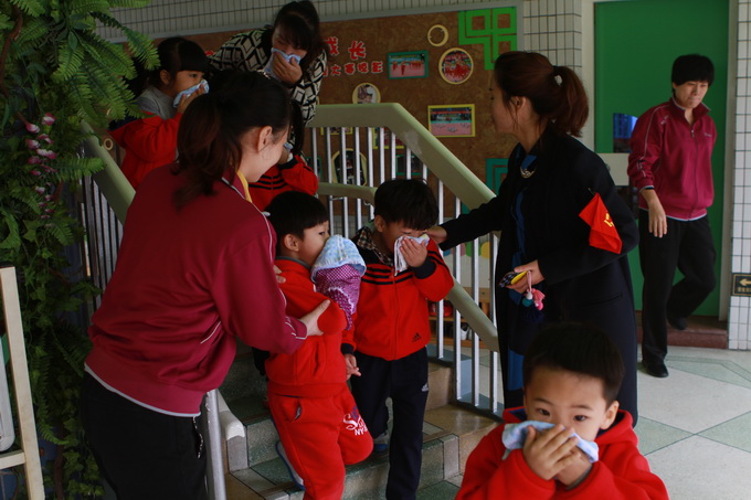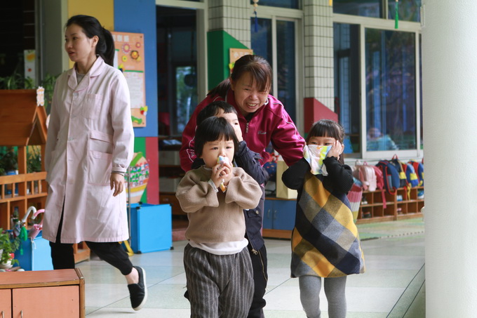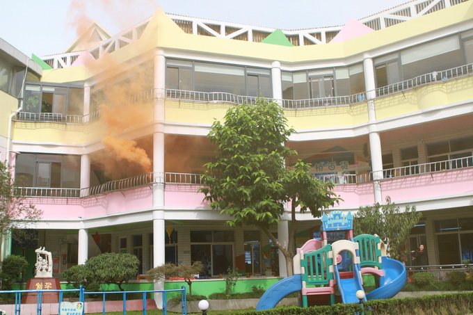 今天是11月9日,为“119”消防宣传日。上午10:30,孩子们和平时一样,有的在操场、有的在后花园、有的在楼顶、有的在教室,各自正有序地开展活动。在大家毫无防备的情况下,浓烟四起,警报响起,孩子们在教师的带领下,下蹲、并用湿毛巾捂住口鼻,随着安全通道路线紧急疏散到大操场。各班老师迅速就位维持好各班幼儿的次序,并快速清点幼儿人数,整个疏散演习过程井然有序,用时2分58秒。