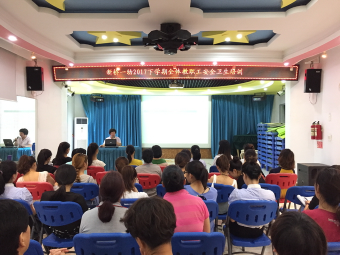 会议由新桥一幼副园长周罗琴老师主持,会议的议程:一、回顾暑期工作,二解读新学期园务计划,三、安全培训。会议主要跟大家分享新学期的园务计划,从以下六个方面:一、安全工作;二、保健工作; 三、教育教学工作;四、教科研工作;五、家长工作;六、新学期幼儿园活动,跟老师们做了详细解读。最后由保健室吴旭华医生为全体教职工做了安全培训。