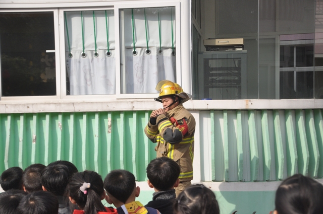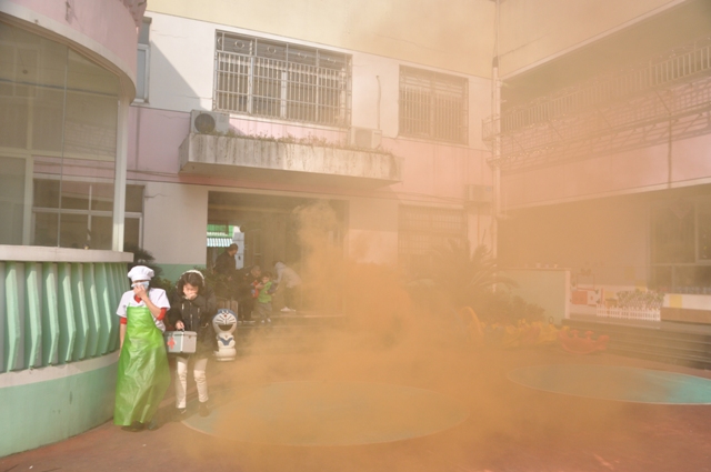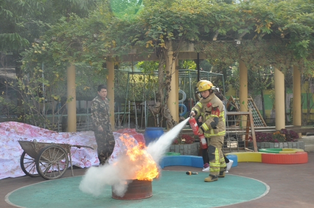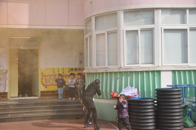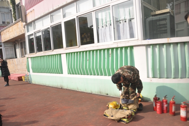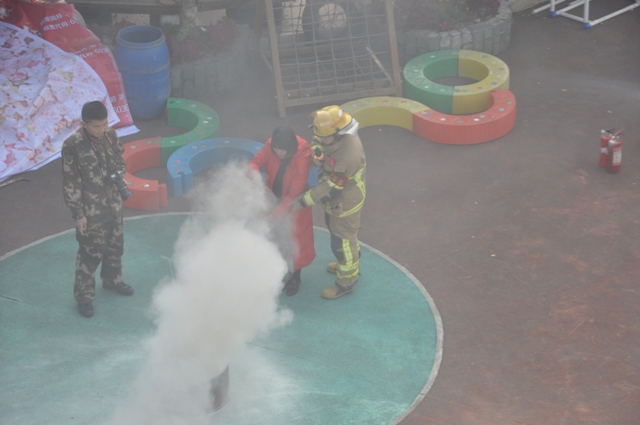 上午10点左右,火警警报突然响起,火警现场浓烟滚滚场面十分逼真,各班老师迅速按紧急预案的疏散路线带领幼儿逃生。每位幼儿都拿起一条毛巾捂住口鼻,来不及拿毛巾的班级用衣袖捂住口鼻弯腰小步快走,从两个疏散路口迅速有序撤离至操场。几分钟后,孩子们集中到操场安全地带,教师迅速清点人数,并向总指挥南老师报告。整个活动用时2分32秒。随后,我园特别邀请新城消防特勤中队消防员为全体师生讲解和普及消防知识。其主要讲解了火灾发生时如何正确的逃生:首先我们要弯腰前行同时用毛巾或衣服捂住口鼻逃到空旷的地方,再拨打119电话。并且讲解了火灾现场的应急处置方案,灭火器的原理、基本操作方法和相关注意事项。当消防员叔叔快速穿戴消防服时,孩子们看得入迷。在认真有关听讲及观摩后,几位教师及保育员亲自进行实践操作如何灭火。面对熊熊燃烧的火堆,教师和保育员们表现十分积极,按照讲解的步骤和方法将火堆燃起的浓烟大火迅速扑灭。
