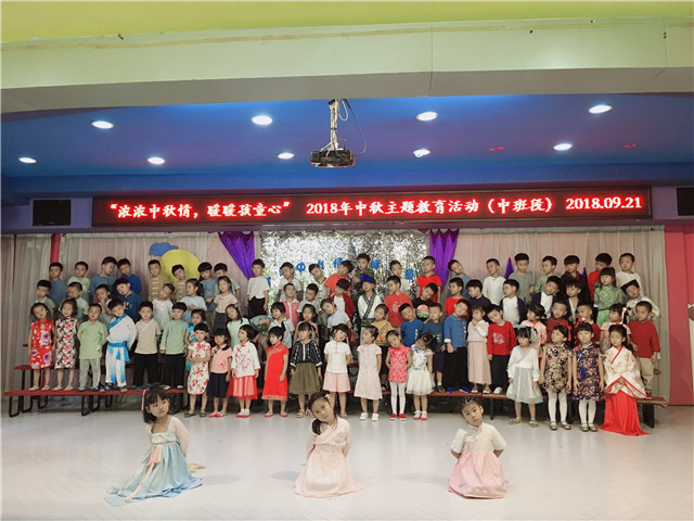 在活动前期,各年级段老师通过谈话、歌曲、故事等形式,让孩子们了解中秋节的来历和典故,知晓中秋节的趣事。在大班年段,各班通过制作中秋贺卡、制作冰皮月饼等形式让孩子们体验节日乐趣,感受中国文化习俗。而中班开展了“浓浓中秋情,暖暖孩童心”中秋主题教育活动,孩子们有的身穿中国传统服饰,洋溢着古色古香,各班通过视频、歌唱、舞蹈、大合唱等形式为孩子们奉上了一盘独具特色的“文化大餐”,让孩子们在歌曲中接受传统节日的熏陶。小班年段开展了“月儿圆 圆庆中秋”主题教育活动。孩子们通过神话视频《嫦娥奔月》、分享月饼活动,引起孩子们对节日的兴趣。孩子们欢聚一堂,共享芳香四溢的月饼,分享着节日的快乐。托小年龄段通过月亮穿新衣、分享月饼及美食来庆祝中秋节的来临。