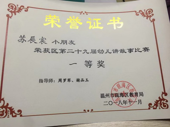 {祝贺新桥一幼苏辰宸小朋友在瓯海区幼儿讲故事比赛中荣获一等奖}