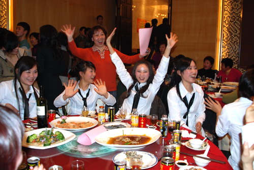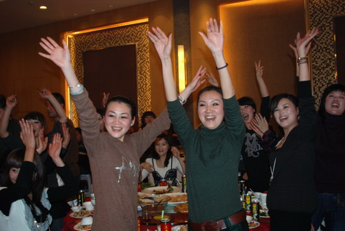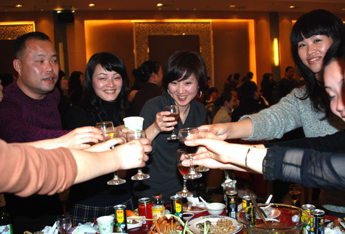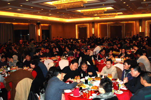随着《祝酒歌》我们的董事长步上舞台举起手中的酒杯:祝大家新年快乐!