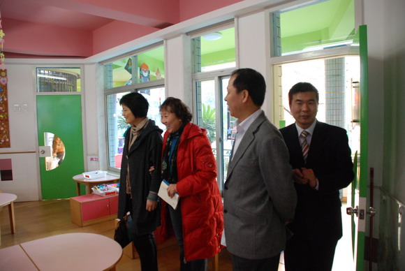 热烈欢迎省教育厅领导莅临我园(左一徐兰妹、左二刘惠玲、中陈蓉蓉、右二李博士、右一徐炳兴)