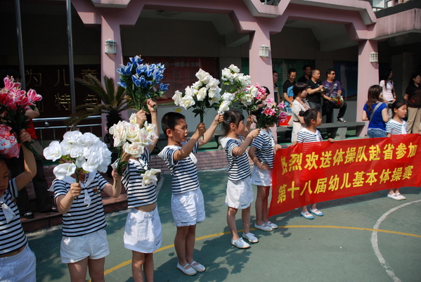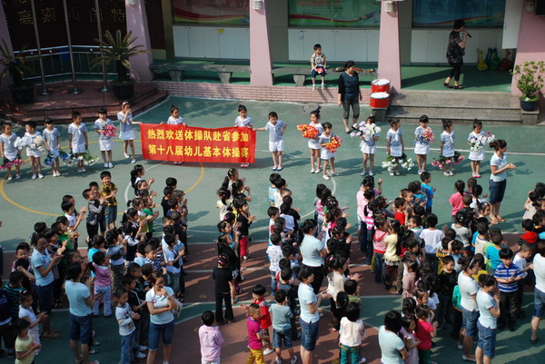 5月15日上午,新桥一幼体操队13名幼儿以及教练、工作人员赴嵊州参加省幼儿基本体操比赛。我们新桥一幼的全体幼儿于8:30为体操健儿们举行了热烈而隆重的欢送会。
