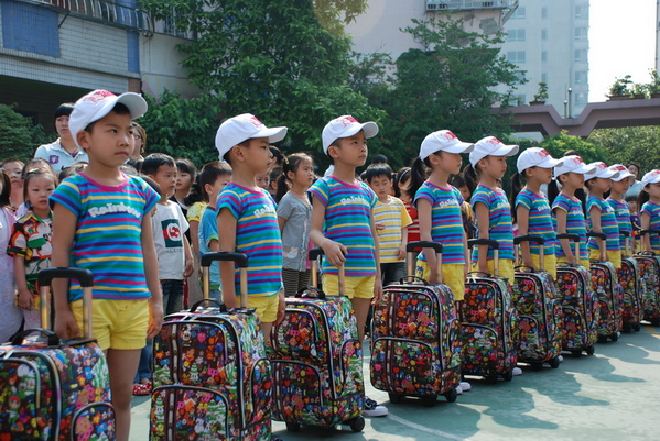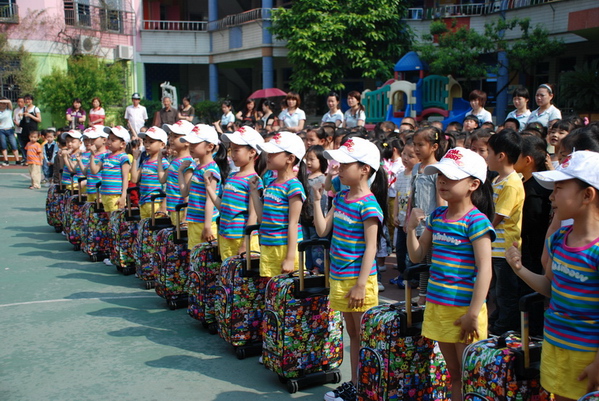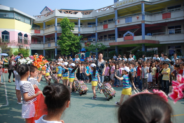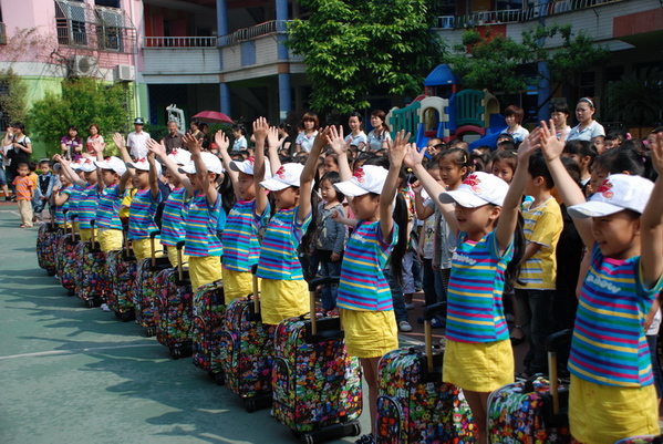 瞧,13位小队员穿着统一的彩虹服,拉着漂亮的手提箱,昂首挺胸、自信满满,多么得神气呀!欢送会由潘老师宣布开始,首先由园长奶奶致欢送词,接着由幼儿代表吴坤哲讲话。在体操队员整齐而又充满气势的誓言之后,在全体幼儿与鲜花队的响亮口号下,体操队踏上了赴赛的路程。