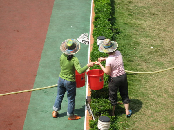 阿姨们带着孩子们制作的草帽