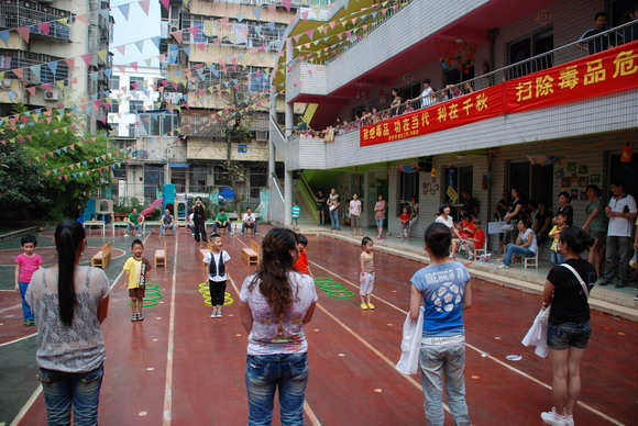 运动会由新桥一幼分园园长陈秀娟主持,前花社区领导、温州科技职业学院学生、新桥一幼幼儿和家长以及前花社区腰鼓队参加了本次活动,各到场人员在远离毒品的横幅上签名,以表拒毒品于千里之外。