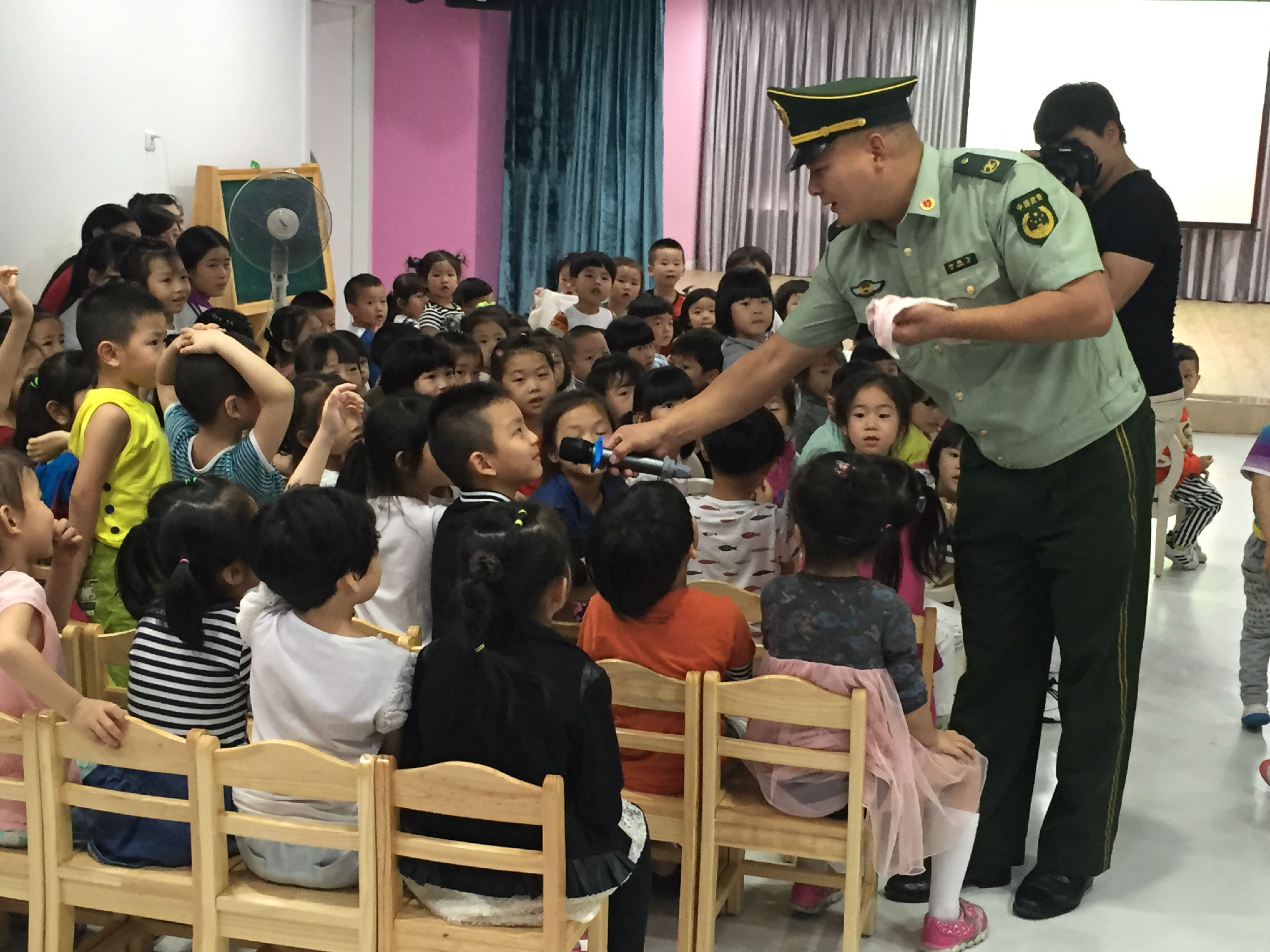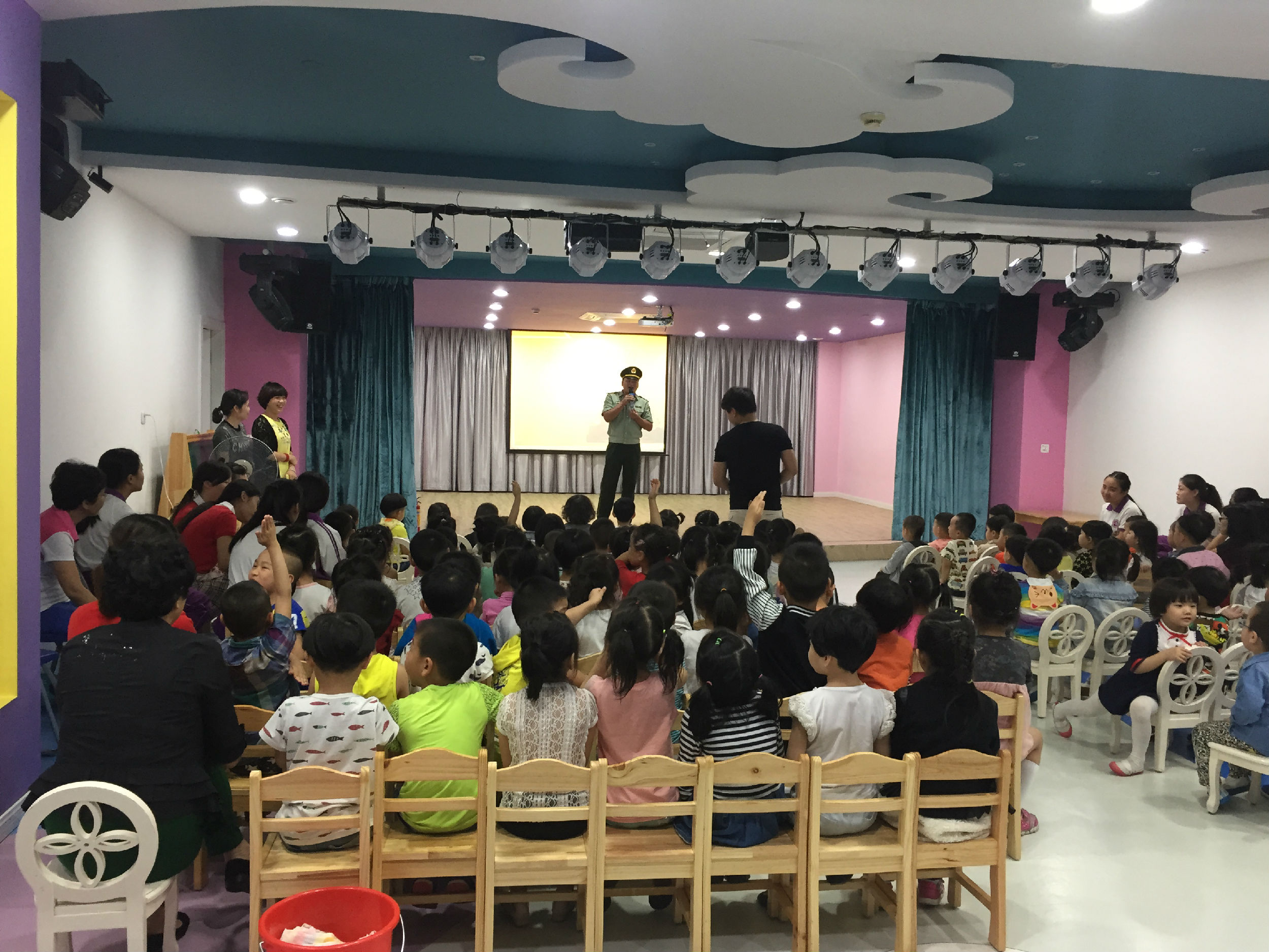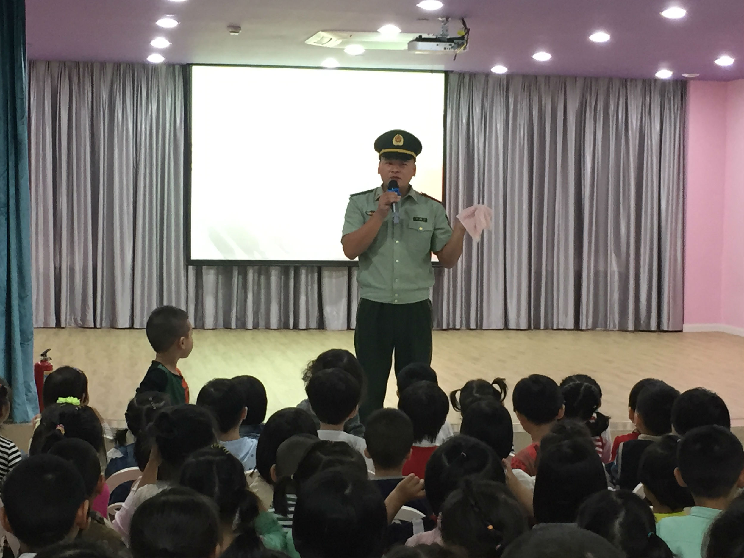 林军官的讲座风趣、幽默、现场还和孩子们进行了良好的互动。通过讲座,孩子们学习、了解并掌握了防火、灭火以及火灾发生时的自救的基本知识和技巧。