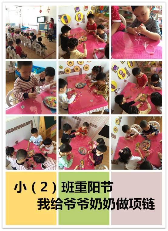 首先每个班级都通过PPT或图片的形式让幼儿们了解重阳节的由来、习俗等,并让幼儿学念了有关于九九重阳节的儿歌诗词,如九月九,九月九日忆山东兄弟等。我们的两个小小班因为幼儿年纪较小,所以老师们先请幼儿们给本班的阿姨捶捶背揉揉肩,让他们知道应该以怎样的方式与关心自己的爷爷奶奶,然后老师们请所有的幼儿回家也要帮自己的爷爷奶奶捶捶背揉揉肩。我们的中班老师事先做好了准备,请所有的幼儿发了一张自己爷爷奶奶的照片,让幼儿们在课堂上骄傲的向小伙伴们介绍自己的爷爷奶奶。最有特色的是我们的大班及小二班,通过制作手工作品的形式来表达对自己爷爷奶奶的爱。大一班的幼儿给爷爷奶奶画像,用画笔画出对爷爷奶奶的爱,然后带回家送给自己的爷爷奶奶。小二班请所有的幼儿动手为自己的爷爷奶奶穿一串漂亮的项链送给奶奶。