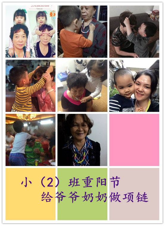 所以结合重阳节开展关于“尊老、敬老”为目的主题活动是非常必要的。为了更好地从小培养孩子们尊老爱老的优良习惯,我们鹿城心桥二幼在重阳节到来之际开展了一系列的活动,每一个班级都积极组织了富有班级特色的主题活动,让我们的孩子了解重阳节,并通过这次活动表达了对自己爷爷奶奶的爱。