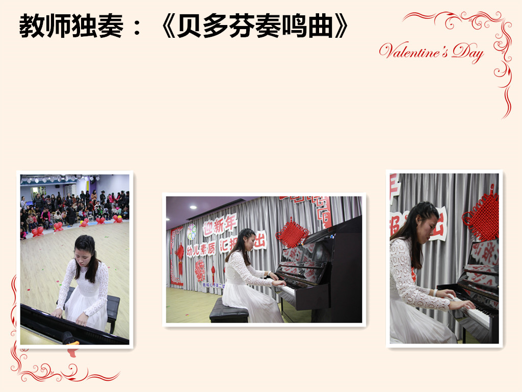 活动在园内英语颁奖中,拉开了帷幕,小选手们举着闪亮的奖杯,脸上露出了灿烂的笑容。本次演出活动内容丰富多彩,节目形式多样,绘画班小朋友将绘画作品做成彩衣穿在身上,以走秀的形式来向大家呈现。舞蹈班小朋友向大家展示成品舞蹈。英语班的小朋友以英语串烧的形式,展示了英语歌曲。这是一个向现场的爸爸、妈妈、叔叔、阿姨展示自己的机会,小演员格外兴奋和高兴,表演起来格外的认真,家长从孩子的表演中感受到了孩子发自内心的快乐和自信。张冠婷老师的独舞《好久不见》更是将气氛推向了高潮。最后在张悦茹老师的钢琴独奏《贝多芬奏鸣曲》中画上了圆满的句号。整个活动演出现场气氛热烈,掌声不断,异彩纷呈,家长对孩子这一学期孩子的进步表示满意,对老师付出的心血和培育表示衷心的感谢!