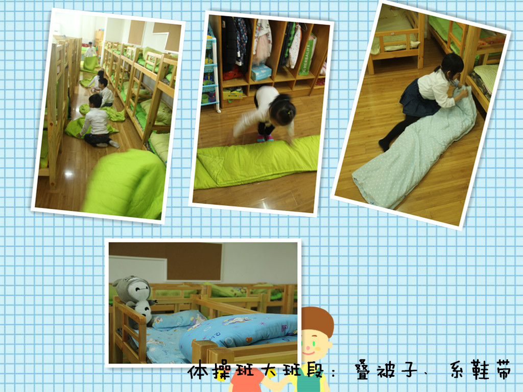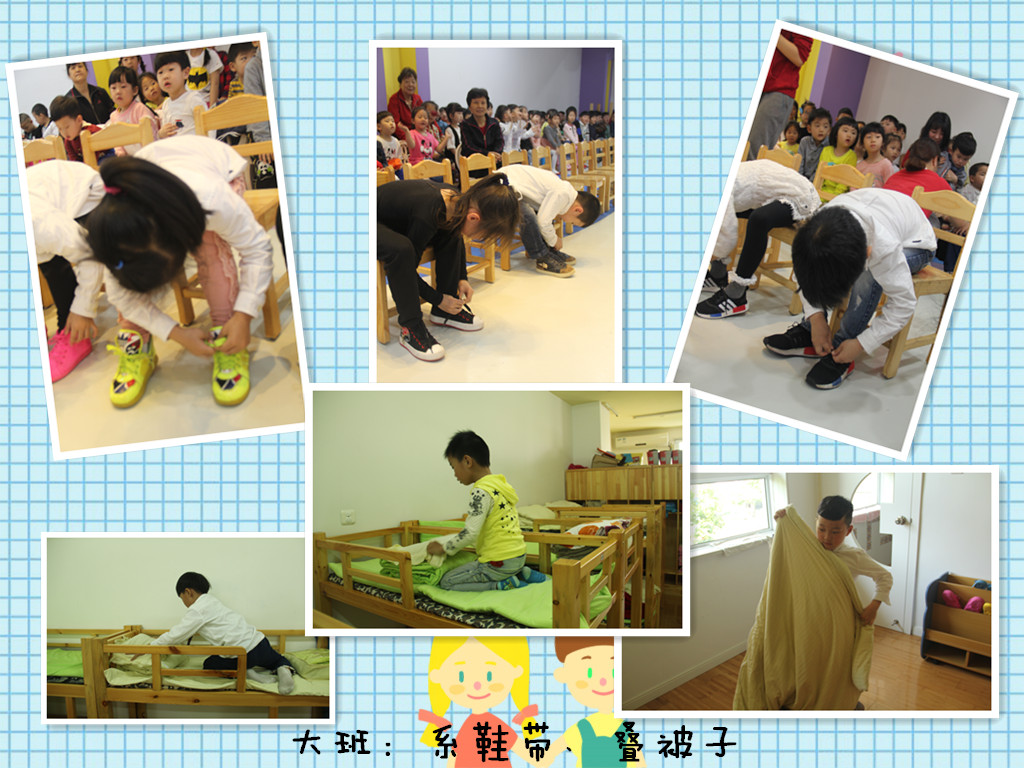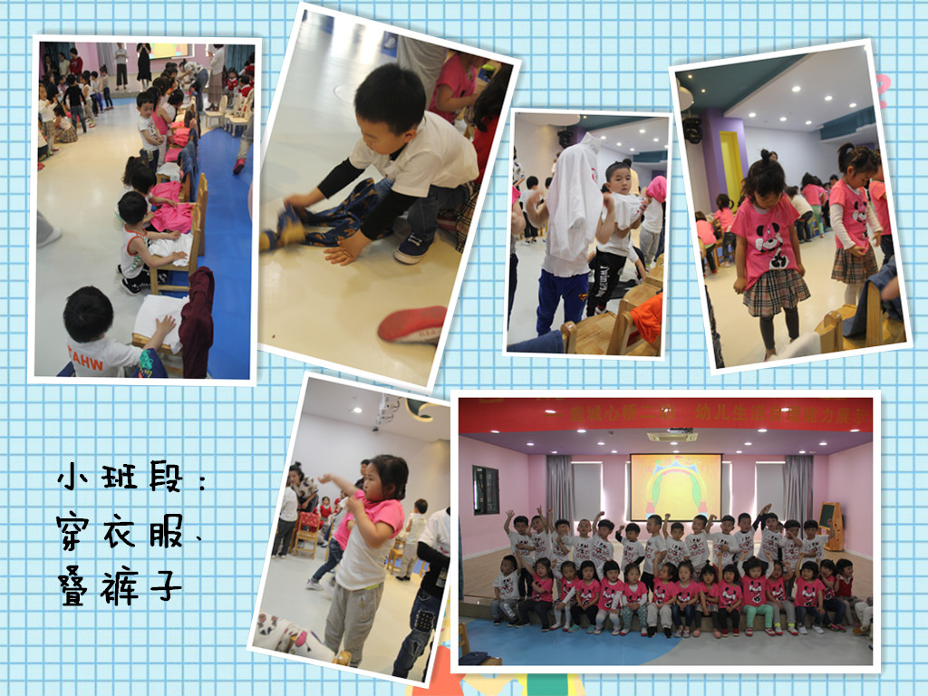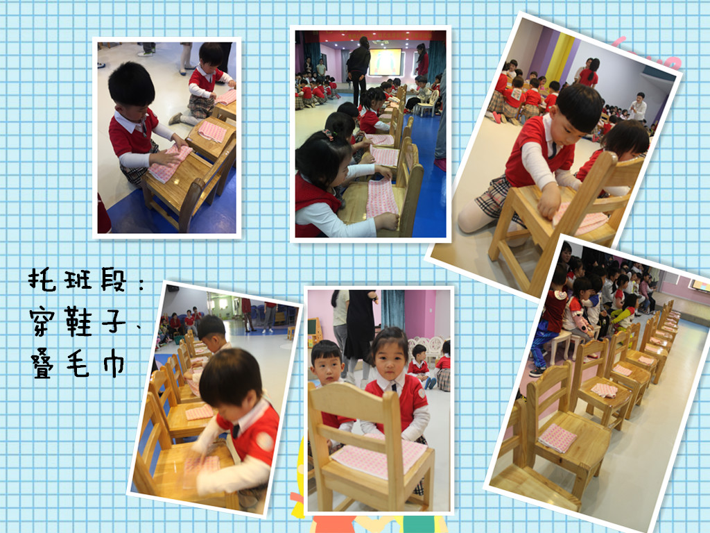 本次展示我园根据幼儿的年龄特点和发展水平,制定了测评项目,以年级组为单位,在游戏中进行。托班进行了穿鞋子和叠毛巾展示;小班进行了穿衣服和叠裤子展示;中班进行了扣纽扣和叠衣服展示;大班进行了系鞋带和叠被子展示。